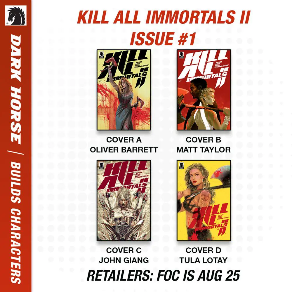 Kill All Immortals II issue #1 By @zackkaps.bsky.social, more. With covers from Matt Taylor, @johngiangart.bsky.social, @tulalotay.bsky.social.