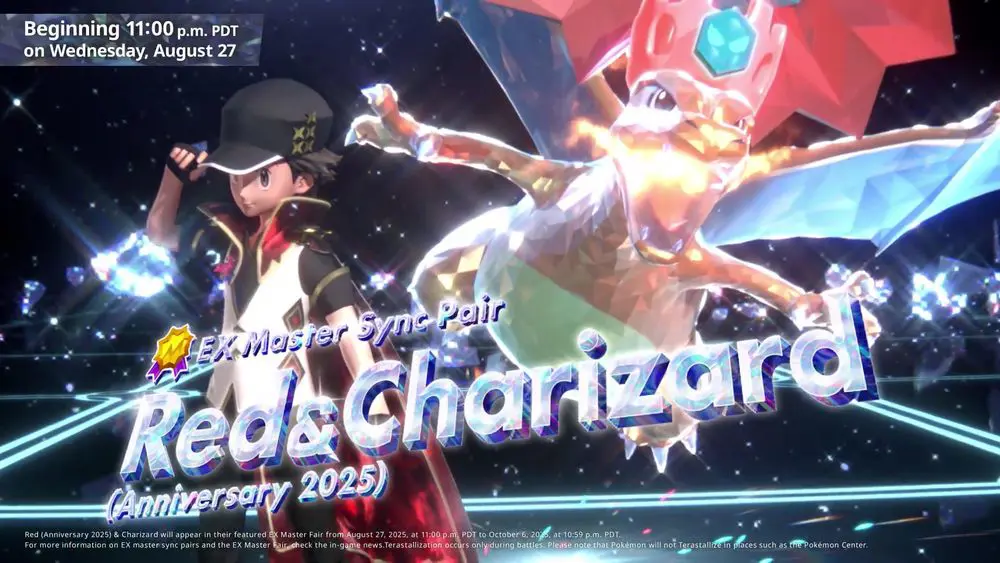 Serebii Update: The Pokémon Masters EX Anniversary event has been announced. Adds Irida & Hisuian Typhlosion, Gloria & Cinderace and Red & Charizard to the game. Runs from August 28th 2025