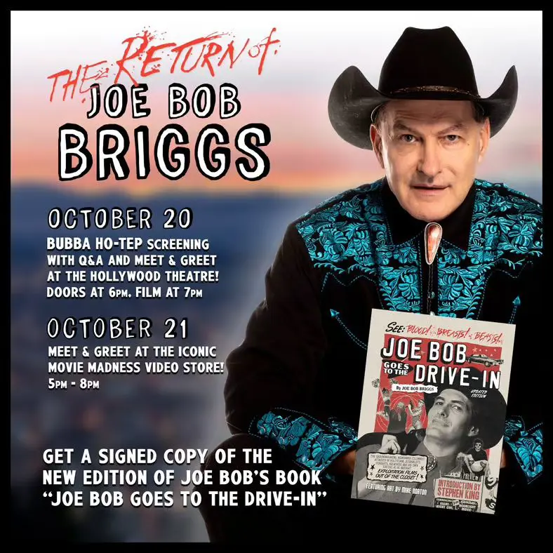 Come one, come all to a special visitation by cult genre film host @therealjoebob123.bsky.social at the Hollywood Theatre next month, for a screening of the film “Bubba Ho-Tep” a book signing celebrating the release of Joe Bob Goes to the Drive-in and more. Details: bit.ly/41ROBrP