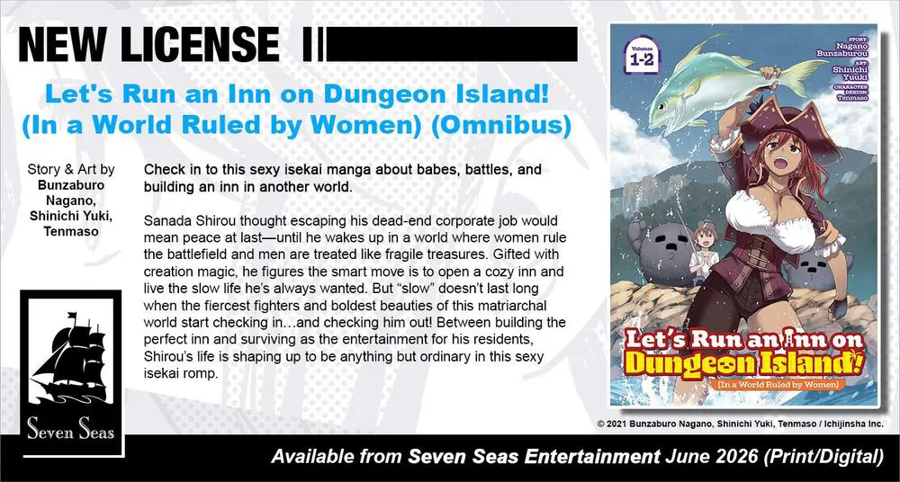 Brand-new license announcement! LET'S RUN AN INN ON DUNGEON ISLAND! (IN A WORLD RULED BY WOMEN) (OMNIBUS) by Bunzaburo Nagano, Shinichi Yuki, and Tenmaso. Check in to this sexy isekai manga about babes, battles, and building an inn in another world.