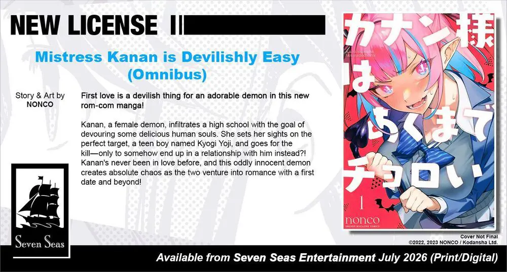 Brand-new license announcement! MISTRESS KANAN IS DEVILISHLY EASY (OMNIBUS) by NONCO. First love is a devilish thing for an adorable demon in this new rom-com manga!