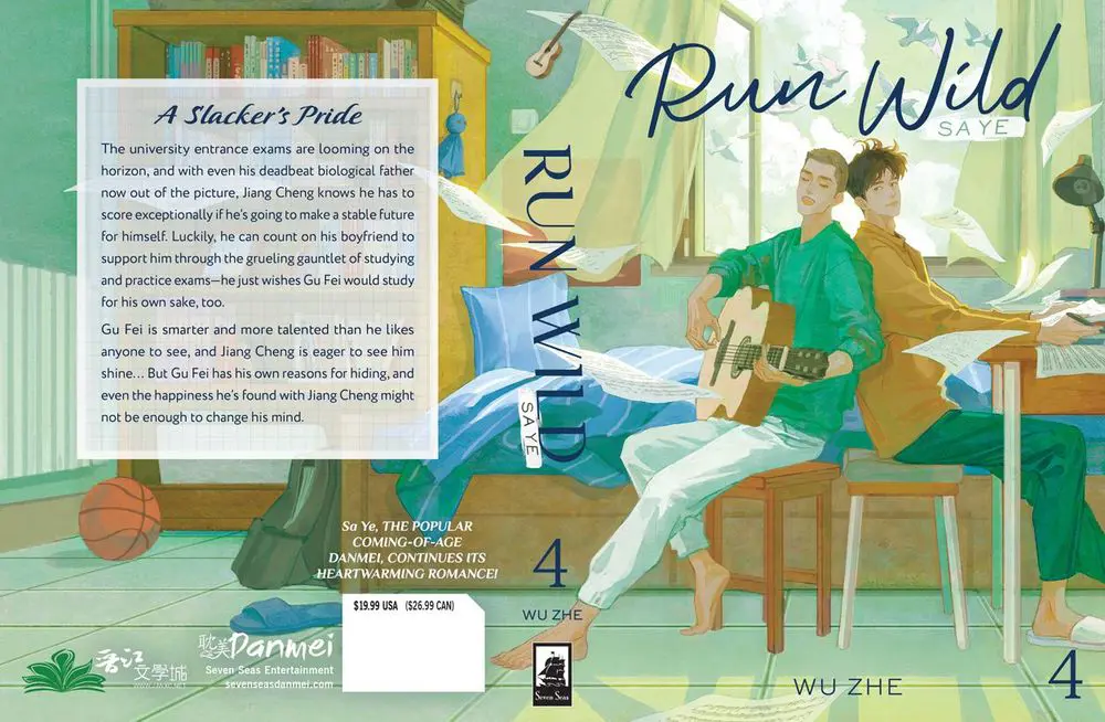 New #SevenSeasDanmei cover reveal! ✨ RUN WILD: SA YE (NOVEL) Vol. 4, the modern #danmei tale by Wu Zhe about two young men stuck in a run-down city—cover art by Tayue Jin (踏月锦) + interior art by Ding Yue Rong! #SaYe
