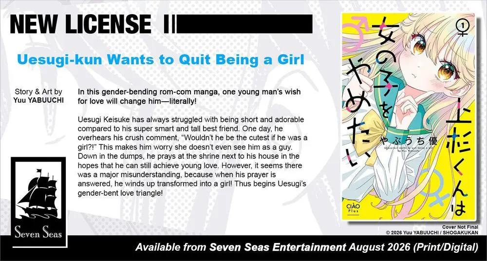 Brand-new license announcement! UESUGI-KUN WANTS TO QUIT BEING A GIRL by Yuu YABUUCHI. In this gender-bending rom-com manga, one young man’s wish for love will change him—literally!