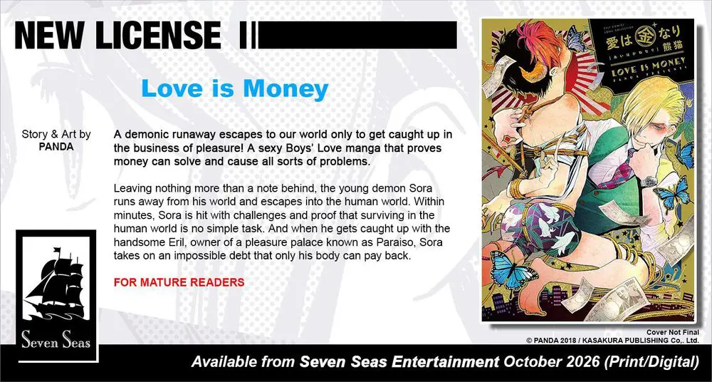 Brand-new license announcement! LOVE IS MONEY by PANDA. A demonic runaway escapes to our world only to get caught up in the business of pleasure! A sexy Boys’ Love / #BL manga that proves money can solve and cause all sorts of problems.
