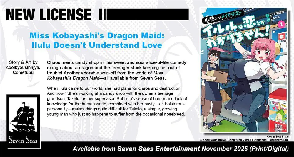 Brand-new license announcement! MISS KOBAYASHI'S DRAGON MAID: ILULU DOESN'T UNDERSTAND LOVE by coolkyousinnjya and Cometubu. Chaos meets candy shop in this sweet and sour slice-of-life manga about a dragon and the teen stuck keeping her out of trouble!