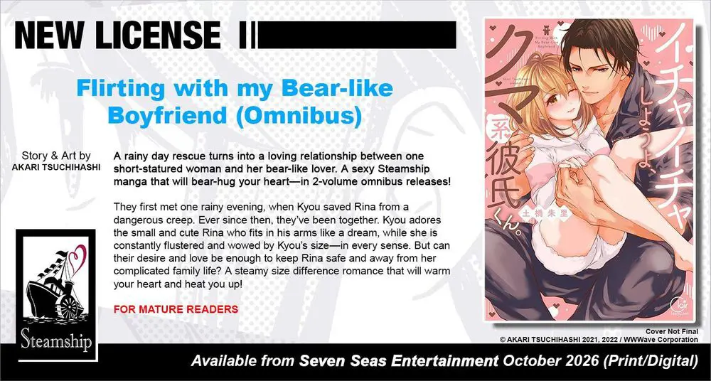 Brand-new license announcement! FLIRTING WITH MY BEAR-LIKE BOYFRIEND (OMNIBUS) by AKARI TSUCHIHASHI. In this sexy Steamship manga, a rainy day rescue turns into a loving relationship between one short-statured woman and her bear-like lover.