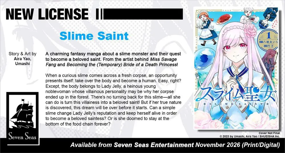 Brand-new license announcement! SLIME SAINT by Aira Yao and Umashi. A charming fantasy manga about a slime monster and their quest to become a beloved saint. From the artist behind MISS SAVAGE FANG and BECOMING THE (TEMPORARY) BRIDE OF A DEATH PRINCESS!