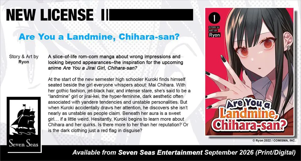 Brand-new license announcement! ARE YOU A LANDMINE, CHIHARA-SAN? by Ryon. A slice-of-life rom-com manga about wrong impressions and looking beyond appearances–the inspiration for the upcoming anime ARE YOU A JIRAI GIRL, CHIHARA-SAN?