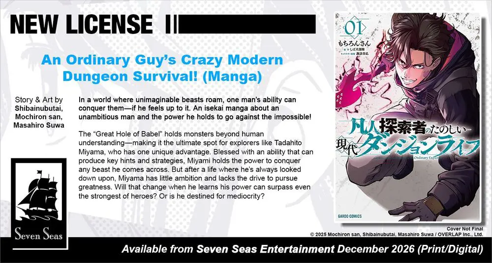 Brand-new license announcement! AN ORDINARY GUY’S CRAZY MODERN DUNGEON SURVIVAL! (MANGA) by Shibainubutai, Mochiron san, and Masahiro Suwa. A fantasy isekai manga about an unambitious man and the power he holds to go against the impossible!
