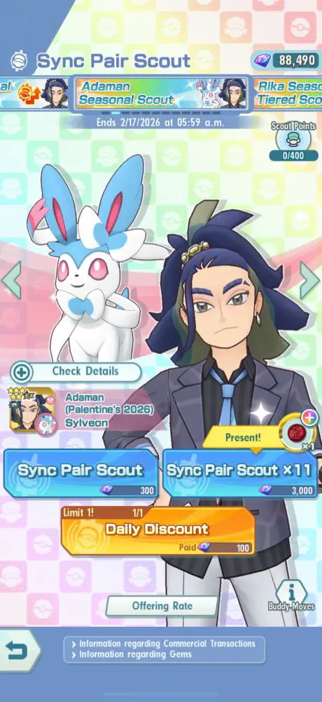 Serebii Update: The Pokémon Masters EX Adaman (Palentine's 2026) & Shiny Sylveon Seasonal Scout is now live