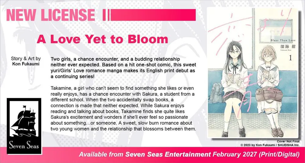 Brand-new license announcement! A LOVE YET TO BLOOM by Kon Fukaumi. Two girls, a chance encounter, and a budding relationship neither expected. Based on a one-shot comic, this sweet #yuri / Girls’ Love manga makes its English print debut as a series!